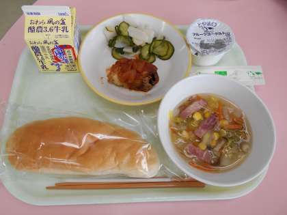 11月14日(月)今日の献立は、学校給食富山の日の献立で、富山県産の食材をたくさん使った献立になっています。米粉コッペパン・牛乳・しいらのイタリアンえごまソースかけ・かぶのゆずサラダ・はくさいスープ・ラフランスヨーグルトでした。富山県産の食材は、米粉、牛乳、しいら、えごまの葉、フルティカトマト、かぶ、にんじん、はくさい、しめじ、ラ・フランスヨーグルトでした。富山のおいしい食材がたっぷり味わえた給食でした。次回は、24日(木)です。