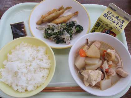 11月16日(水) 今日の給食 公開日 2022/11/16 更新日 2022/11/16 給食室から 11月16日今日の献立は、ごはん、牛乳、わかさぎのフリッター、梅肉和え、里芋と厚揚げのうま煮、のり佃煮です。