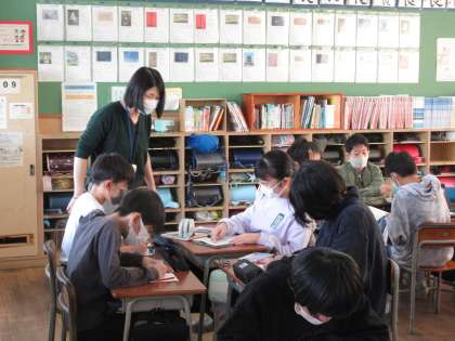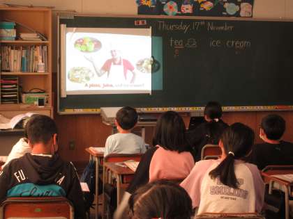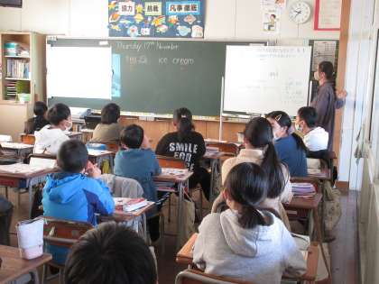 外国語科では、物の値段を尋ねる練習をしています。物を買うときに、気持ちのよい受け答えができるように伝え方も工夫していました。