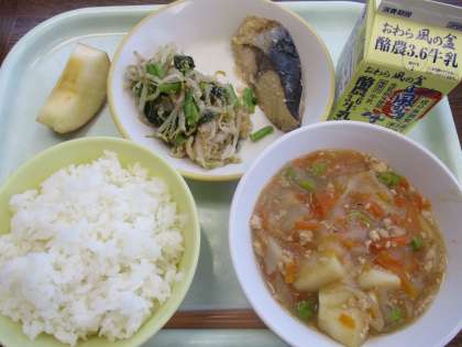 11月18日今日の献立は、ごはん、牛乳、ふくらぎの西京焼き、小松菜のごま和え、じゃがいものそぼろ煮、りんごです。そぼろ煮は、じゃがいも、にんじん、グリンピース等が入っていて、色合いがよく、食欲をそそられます。とろみを付けてあり、温かく食べられました。りんごは蜜があり、甘くておいしかったです。今日もおいしくいただきました。