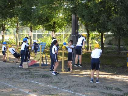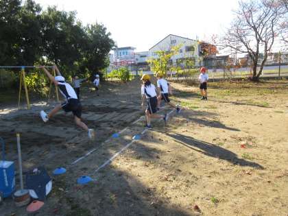 体育科の学習では、走り幅跳びと鉄棒運動に取り組んでいます。走り幅跳びでは、3歩のリズムで踏み切り、両足で着地する練習を行いました。来年のチャレンジ陸上に向けて、練習を積み重ねていきたいですね。