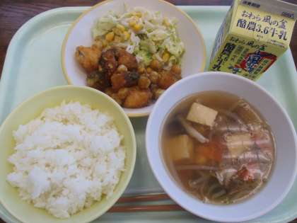 11月21日今日の献立は、ごはん、牛乳、魚と豆のカレー揚げ、れんこんサラダ、豆腐スープです。今日のカレー揚げの魚は、ホキが使われています。ホキは、南半球で捕れるタラと同様の白身魚です。一口大にカットされ、下味が付いていて、とても食べやすかったです。今日もおいしくいただきました。
