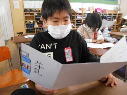 国語科では、「すがたをかえる大豆」の学習を生かして、自分で選んだ食材の変身の様子をリーフレットにまとめました。今日は、出来上がったへんしんブックを仲間と読み合いました。互いの文章の工夫について、よさを伝え合いました。