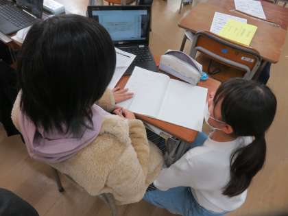 まずは教科書を使って学習する。わからないことは、自分で質問する。先生はもちろん、学級の仲間に相談しながら学びを深めていました。