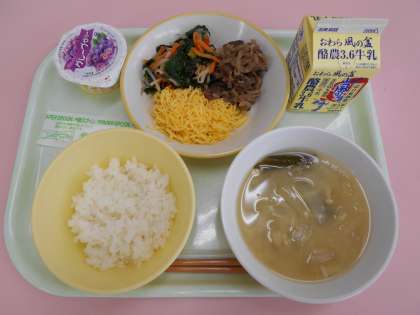 11月29日(火)今日の献立は、ごはん・牛乳・ビビンバ(焼き肉・ナムル・錦糸卵)・みそ汁・ぶどうゼリーでした。ビビンバとは、韓国の混ぜごはんです。韓国語で、混ぜることを「ビビン」といい、ごはんのことを「パ」と言います。どの学年も、ごはんに混ぜて食べていました。今日もおいしくいただきました。