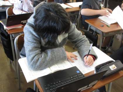 国語科では、表やグラフを用いて意見文を書く練習をしています。今日は、自分の考えを裏付ける資料を教科書やインターネットから用意し、自分の考えを整理しました。