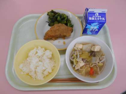 12月13日(火)今日の給食 公開日 2022/12/14 更新日 2022/12/14 給食室から 12月13日(火)今日の献立は、きときとランチで、ごはん・牛乳・ふくらぎのみぞれがけ・とろろ昆布和え・はくさいなべでした。「きときと」とは、新鮮でいきいきとした様子を表す富山県の方言です。今日のきときとランチは「とろろ昆布和え」です。こまつなときゅうりをとろろ昆布で和えました。とろろ昆布は、ごはんにかけるだけではなく、和え物や汁物に加えてもおいしいです。今日もおいしくいただきました。