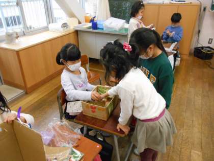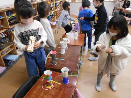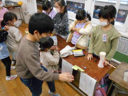 1年生は秋の落ち葉や木の実を使ったおもちゃを作りました。子供たちは秋のおもちゃの店を開き、1、2、3組で交流して遊びました。「1組では演奏会をしていたよ」「2組のどんぐりのおもちゃすごかった」「3組はたくさんお客さんが来たね」と話す子供がいました。