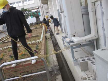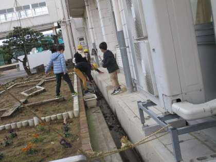 登校後、落ち葉集めの他、溝の落ち葉や泥あげを行っています。学校のために進んでと鈴でいます。