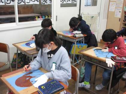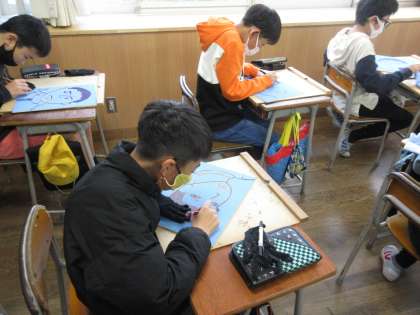 図工科の学習では、自画像の版画づくりを行っています。今日から、彫刻刀を使って彫る作業に入りました。静かな教室で、削る音だけが響いています。