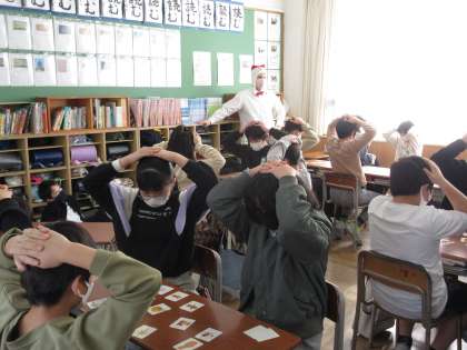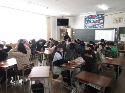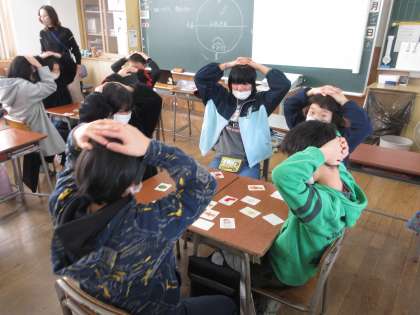 2学期最後の外国語科の授業でした。もうすぐクリスマスということもあり、ALTの先生はサンタクロースに変身し、授業が行われました。クリスマスにまつわるカードをグループで取り合い、外国語での言い方を積極的に学んでいました。