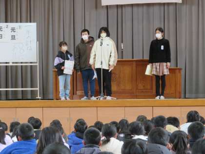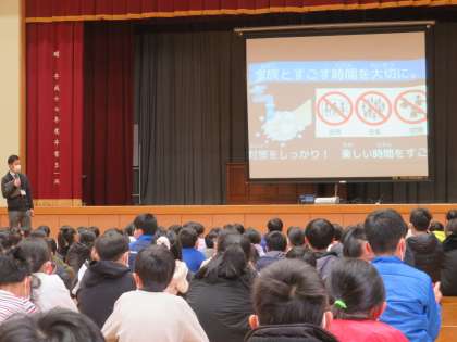 生徒指導主事からは、生活リズムを守る、お金の使い方・火遊び万引きの禁止、感染症予防などの冬休みの過ごし方について話があり、真剣に聴いていました。