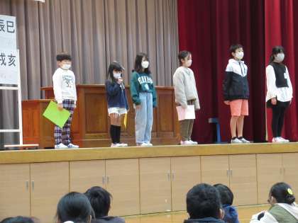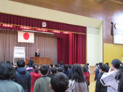 体育館での始業式では、校長先生のお話や新年の誓いを学年の代表の子供たちが発表しました。2年生の代表の人も、堂々と発表しました。