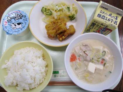1月18日今日の献立は、ごはん、牛乳、ちくわのカレー揚げ、あわせ和え、豆乳汁、ヨーグルトです。豆乳汁は、豆乳が入ったみそ汁で、いつものみそ汁よりまろやかに仕上がっています。今日は、牛乳に加えてヨーグルトが出ました。カルシウムがいっぱいですね。今日もおいしくいただきました。