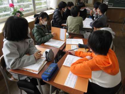 3学期の外国語の学習では、日本を紹介する動画づくりを行います。今日は、各グループに分かれ、どのような内容を紹介したいかグループで話し合いました。日本ならではの文化もたくさんあり、子供たちは積極的に意見を出し合いました。