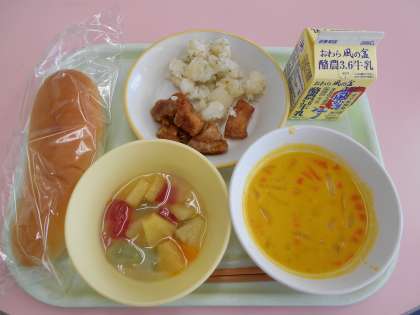 今年の献立のテーマは『本の世界を味わおう、読んで楽しい、食べておいしいお話』です。本に登場する料理や食材を取り入れ、その本にちなんだ献立を実施します。1日目は、「シンデレラ」です。献立は、コッペパン・牛乳・豚肉のハニーマスタードソースかけ・グリーンポテト・シンデレラポタージュ・ガラスのカクテルでした。シンデレラが、かぼちゃの馬車に乗る場面から、かぼちゃを使った「シンデレラポタージュ」にしました。ガラスの靴のキラキラした様子を表現した「ガラスのカクテル」は、シロップの中にフルーツとゼリーを加えました。どの学年も、シンデレラの世界を楽しんでいました。