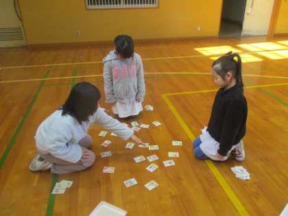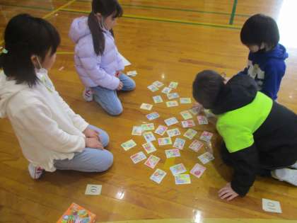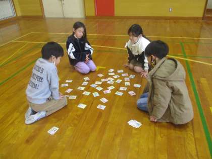 今回は、3クラス全体でグループをつくり、かるたをしました。普段、あまり関わらない友達とも楽しく取り組んでいました。練習の成果を発揮しようと、子供たちみんなが頑張っていました。