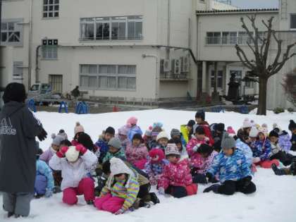 グラウンドにたくさんの積もり、雪遊びに行きました。
