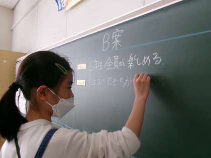 今回の学級会は、3年生の実行委員が司会と書記を行いました。6年生はもちろん、1〜5年生も楽しめて、思い出に残る出し物にしたいという思いが伝わる話し合いでした。