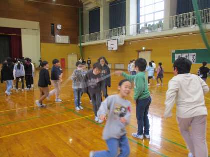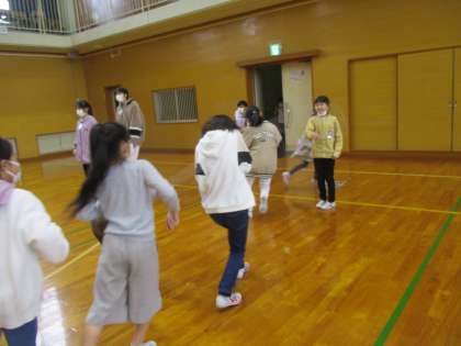 体育館で長なわ跳びの練習しています。だんだん連続で入れるようになってきました。