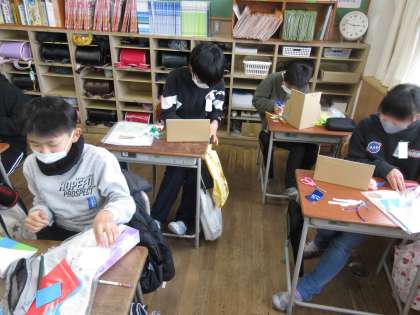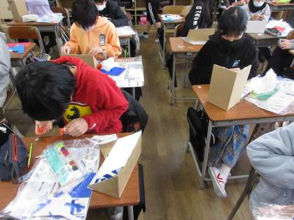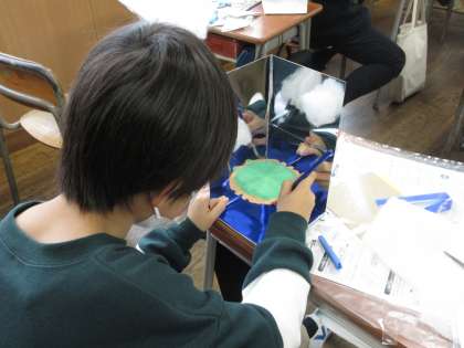 図工の学習では、鏡の特性を利用した作品づくりを進めています。鏡の反射を利用して、奥行きを出したり、物体が続くようにしたりと工夫を凝らす様子が見られました。