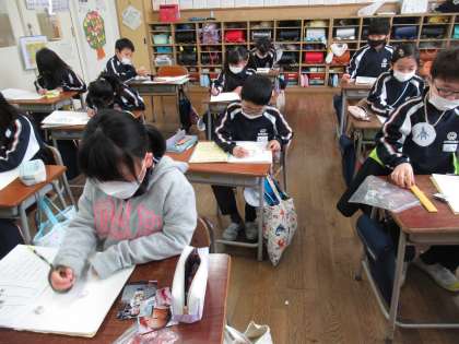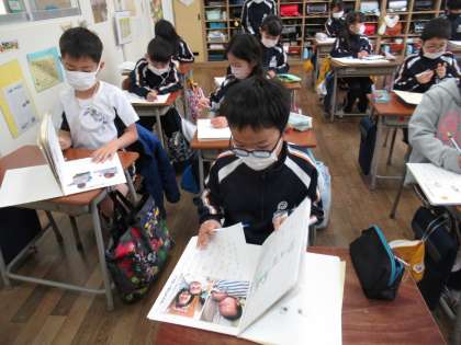 生活科の時間に、自分の成長アルバムをつくっています。家の人から、生まれた時の話や、小さいころのことなどを聞いたり、調べたりして取り組んでいます。家の人の思いに気付く場面もあり、熱心に作業を進めています。