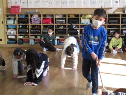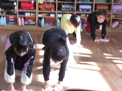 そうじの時間です。友達と協力して取り組んでいます。ぞうきんがけも上手です。