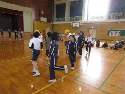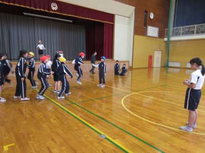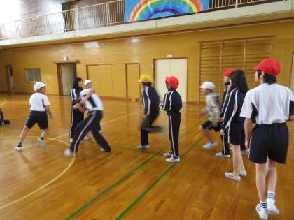 大縄の8の字跳びでは、チームごとに声を出し合って跳ぶ姿が見られました。チームで呼吸を合わせて回数を重ねていました。