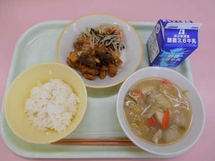 2月16日(木)今日の献立は、きときとランチでした。献立は、ごはん・牛乳・鶏肉とレバーのカレー風味・ナムル・たら汁です。「たら汁」は、富山県朝日町の郷土料理です。たらをぶつ切りにして、身だけではなく頭や内臓など1匹すべてを鍋に入れ、みそで煮込んだ料理です。頭や内臓など、すべての部分を使うため、たらのおいしさを丸ごと味わうことができます。給食のたらは、「まだら」という種類です。