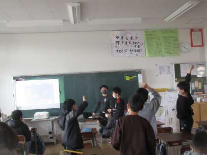 休み時間に、プログラミング係がつくったゲームで何人かの子供たちが遊んでいました。