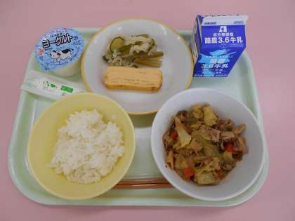 2月20日(月)今日の献立は、ごはん・牛乳・厚焼き卵・茎わかめの酢の物・回鍋肉・ヨーグルトでした。回鍋肉は、中国の料理です。日本語では、「ホイコーロー」といいますが、中国語では、「ホイグオーロウ」と言います。中国では、肉と一緒に炒める野菜は、にんんくの葉です。日本は、キャベツがたくさん入っています。給食のキャベツもとてもたくさんありました。調理員さんは、力のいる調理だったと思います。辛みはなく、児童達が食べやすい味付けに仕上がっていました。今日もおいしくいただきました。