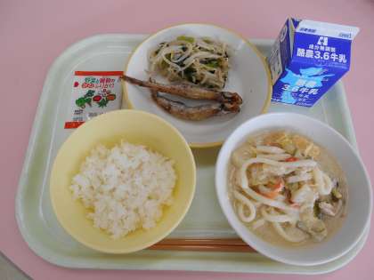 2月21日(火)今日の献立は、ごはん・牛乳・ししゃもの唐揚げ・おひたし・白ごま豆乳うどん・ふりかけでした。白ごま豆乳うどんは、豆乳、ねりごま、砂糖、しょうゆ、みそで味付けしてあります。練りごまの風味が感じられ、豆乳と味噌の相性がバッチリで、おいしかったです。どの学年も、たくさん入っていましたが、ほぼ完食していました。