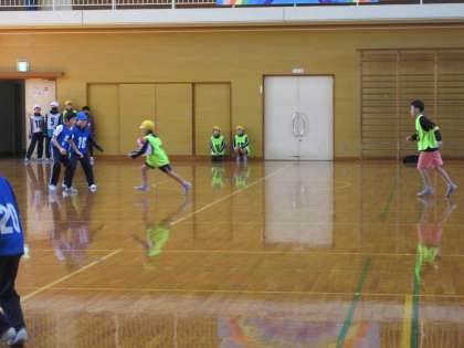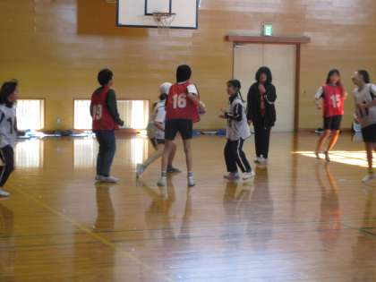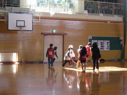 体育の学習では、バスケットボールを行っています。今日は、チームに分かれ、ミニゲームを行いました。短い時間ですが、ボールを一所懸命追いかける姿が見られました。