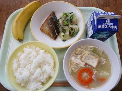 2月24日(金) 今日の給食 公開日 2023/02/24 更新日 2023/02/24 給食室から 2月24日今日の献立は、ごはん、牛乳、あじのみりん焼き、チンゲンサイソテー、豚汁、バナナです。あじは小骨がなく、食べやすかったです。ごはん、魚、野菜、みそ汁は和食の基本ですね。今日もおいしくいただきました。