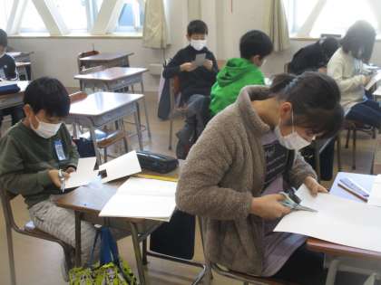 2月28日(火)4年生 算数 公開日 2023/02/28 更新日 2023/02/28 2023年度 4年生 直方体を画用紙で作りました。 図形を見ながら、同じ形が何組あるかや長さに注目してつくることができました。