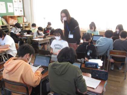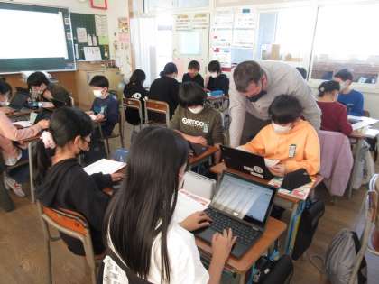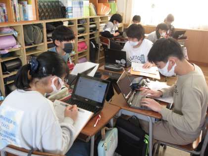 外国語では、Whoを使った人物当てクイズに向けて準備を進めています。今日はクイズのスライド作りを行いました。写真や文章を入れてスライドを作る作業も上手になってきました。
