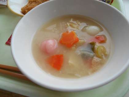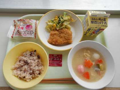 3月2日(木)今日の献立は、卒業お祝い献立で、赤飯・牛乳・とんかつ・コーン和え・紅白白玉汁・もものタルトでした。紅白白玉汁には、花形人参が入っていました。午後からは、卒業を祝う会が行われたので、ちょうどよかったです。今日もおいしくいただきました。