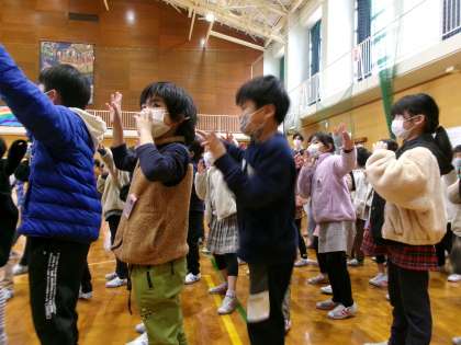 卒業を祝う会で、1年生は「ありがとう」のメッセージを書いたメダルを6年生にプレゼントしました。また、大好きだよという気持ちを込めて、歌のプレゼントをしたり、2年生と一緒にダンスを楽しんだりしました。一生懸命に歌い、踊る姿が見られました。