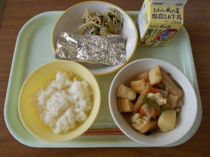 3月9日(木)今日の献立は、ごはん・牛乳・さばの銀紙焼き・ごまびたし・関東だきでした。関東だきとは、醤油ベースのだし汁で煮た江戸発祥の「おでん」のことで、「関東煮」とも呼ばれます。濃い口醤油の発祥を機に作られた「関東炊き」は、その濃い色のだし汁が特徴です。給食の関東だきは、薄味にしてあり、味が良く染みた、おいしい煮物に仕上がりました。今日もおいしくいただきました。