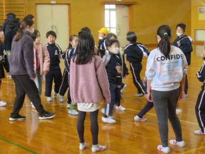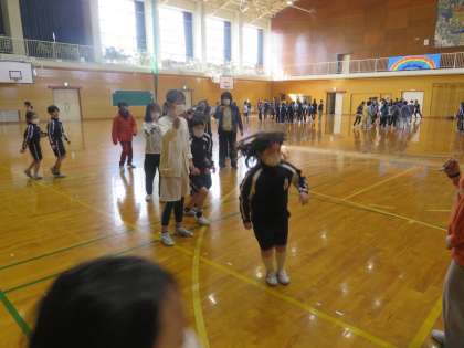 休み時間に体育館で2年生と一緒に長縄をしました。