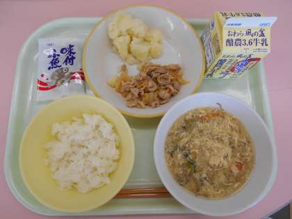 3月20日(月)今日の給食 公開日 2023/03/20 更新日 2023/03/20 給食室から 3月20日(月)今日の献立は、ごはん・牛乳・豚肉のキムチ炒め・こふきいも・中華かき玉汁・味付け小魚でした。豚肉のキムチ炒めは、辛さ控えめで、児童にも食べやすい味付けでした。3学期の給食も、残り2日です。おいしくいただきましょう。
