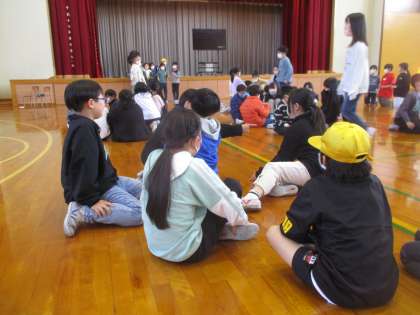 1組は「スーパーいす取りゲーム」で普通のいす取りゲームではなく、グループの仲間と協力してクイズを解くなど、みんなが楽しめるような工夫していました。