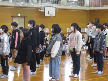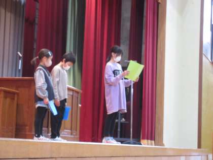 修了式が行われ、代表児童が修了証を受け取りました。校長先生の話をしっかりと聞き、元気な声で校歌を歌いました。また、一年間にがんばったことを代表児童が発表しました。