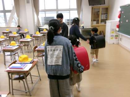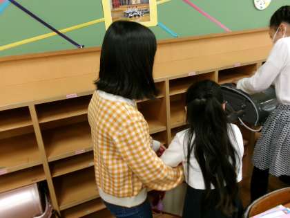 玄関から教室まで新入生を案内しました。ランドセルをしまうロッカーを一緒に確認する際には、優しい言葉がけをする様子が見られました。