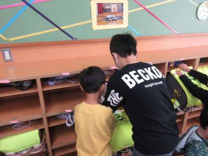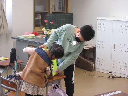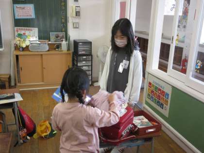 1年生の朝の準備に、6年生がサポートに行っています。優しく声をかけたり、温かく見守ったりする様子が見られました。