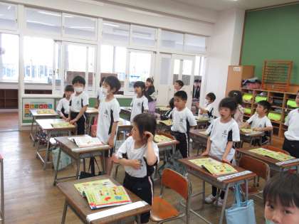 教科書の絵の中から見付けた歌を歌いました。「こいのぼり」や「いぬのおまわりさん」等、知っている歌も多く、体を動かしたり声の大きさを変えたりして楽しんでいました。