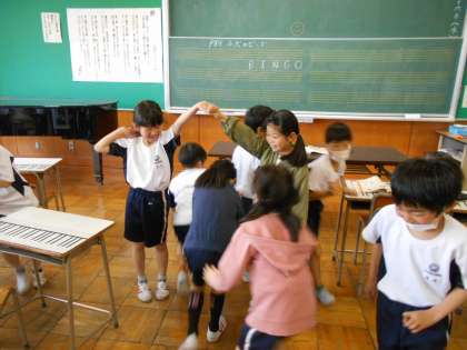 ウォーミングアップに「ロンドン橋」「子犬のBINGO」で体を動かしました。