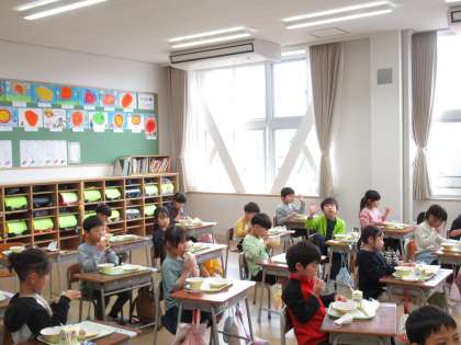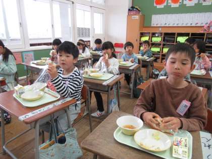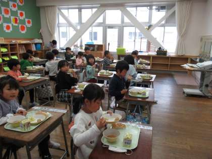 今日の給食のメニューは、サミット献立(ドイツ風)で一口大のハンバーグや、具だくさんスープが出ました。もりもり食べていました。