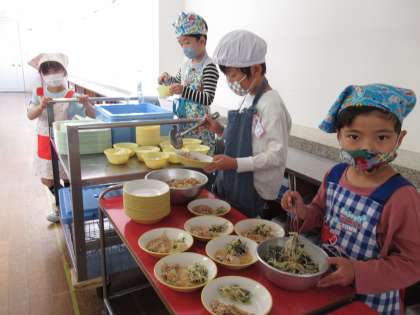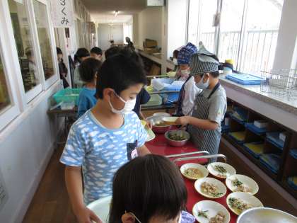 配膳や、給食当番の仕事もだんだん慣れてきました。がんばっています。