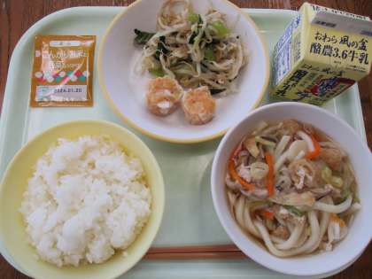 5月17日今日の献立は、ごはん、牛乳、かやくうどん、にんじんシューマイ、おひたし、野菜ふりかけです。